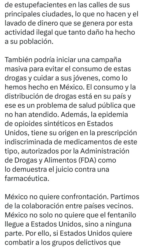 La Cuarta Transformación no evade responsabilidades, pero tampoco acepta narrativas tramposas. En cuatro meses, el gobierno mexicano aseguró más de 40 toneladas de drogas, incluyendo millones de dosis de fentanilo, y detuvo a más de diez mil personas vinculadas a grupos delictivos. Mientras tanto, Estados Unidos no ha sido capaz de frenar la venta de drogas en sus ciudades ni de asumir que la crisis de opioides tiene su origen en la prescripción indiscriminada de medicamentos autorizados por su propia FDA.