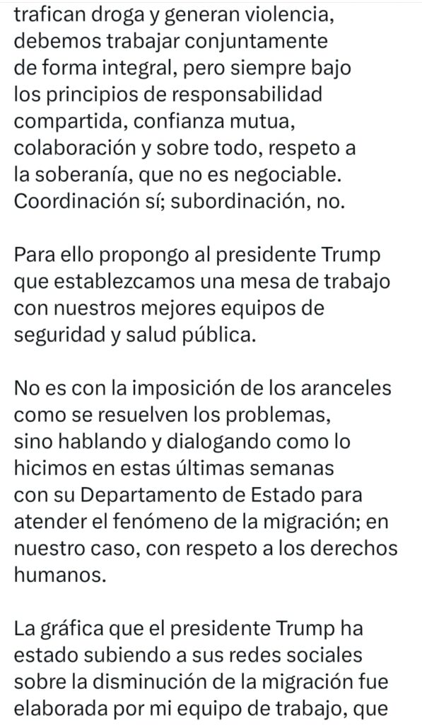 Frente a la amenaza y la imposición, la Presidenta Sheinbaum ha respondido con una propuesta de cooperación basada en la razón, el derecho y la soberanía. Coordinación sí; subordinación, no. México no quiere confrontación, pero tampoco acepta aranceles ni amenazas militares como instrumentos de presión. La mesa bilateral propuesta en materia de seguridad y salud pública demuestra que la 4T apuesta por soluciones de fondo y no por la violencia.