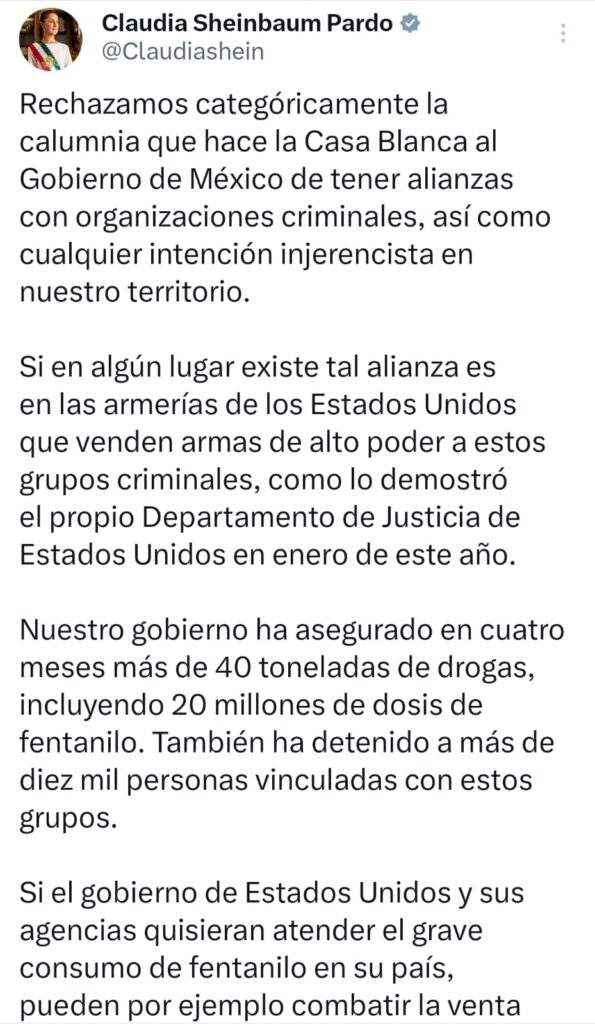Por ello, es importante recordar el posicionamiento de la presidenta Claudia Sheinbaum desde el pasado 1 de febrero de 2025, cuando marcó con claridad el rumbo de la política exterior mexicana. Al rechazar categóricamente las calumnias de la Casa Blanca y cualquier intención injerencista, la mandataria puso el acento donde corresponde: si existe una alianza con el crimen organizado, esta se encuentra en las armerías de Estados Unidos que venden armas de alto poder y en un sistema que permite el lavado de dinero y el consumo masivo de drogas, como lo ha demostrado el propio Departamento de Justicia estadounidense.